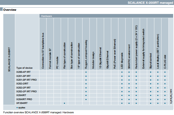 SCALANCE X204IRT • For configuring electrical Industrial Ethernet linear bus, star or ring topologies with 4 electrical ports SCALANCE X202-2IRT • For configuring electrical/optical Industrial Ethernet linear bus, star or ring topologies with two electrical ports and two glass fiber optic ports SCALANCE X202-2P IRT • For configuring electrical/optical Industrial Ethernet linear bus, star or ring topologies with two electrical ports and two optical POF fiber optic ports SCALANCE X201-3P IRT • For configuring electrical/optical Industrial Ethernet linear bus, star or ring topologies with one electrical port and three optical POF fiber optic ports SCALANCE X200-4P IRT • For configuring optical Industrial Ethernet linear bus, star or ring topologies with 4 optical POF fiber-optic ports SCALANCE X204 IRT PRO • For the construction of electrical Industrial Ethernet linear, star or ring topologies with four electrical ports in degree of protection IP65/67 with PROFINET-compliant push-pull connection technology SCALANCE X202-2P IRT PRO • For the construction of electrical/optical Industrial Ethernet linear bus, star or ring structures with two electrical and two optical POF/PCF fiber optic ports in degree of protection IP65/67 with PROFINET-compliant push-pull connection technology SCALANCE X201-3P IRT PRO • For the construction of electrical/optical Industrial Ethernet linear bus, star or ring topologies with one electrical and three optical POF/PCF fiber optic ports in degree of protection IP65/67 with PROFINET-compliant push-pull connection technology |